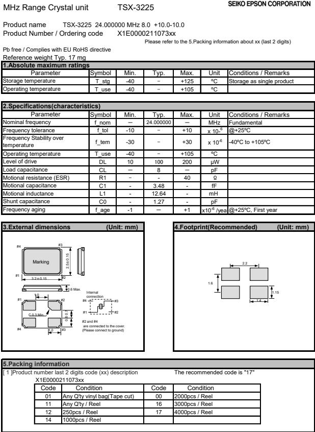 | X1E000021107316 | 3.2 x 2.5 x 0.6mm | TSX-3225 | 24.000000 MHz | 8 pF | +/-10 ppm | +/-30 ppm | -40 to +105 °C |