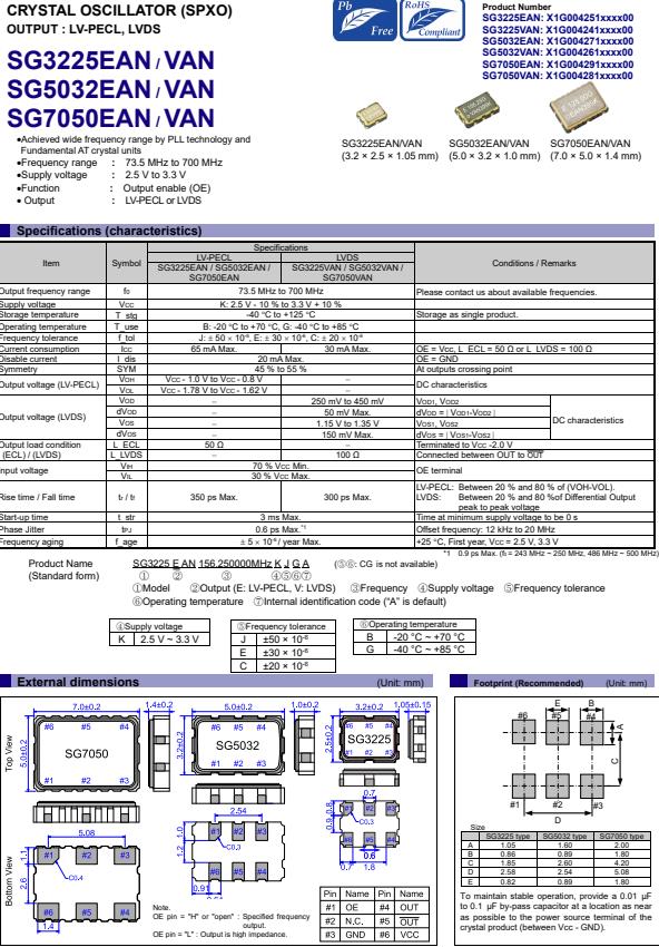 | X1G004261000100 | SG5032VAN | 100.000000 MHz | 5.00 x 3.20 x 1.20 mm | LVDS | 2.250 to 3.630 V | -40 to 85 °C | +/-50 ppm |