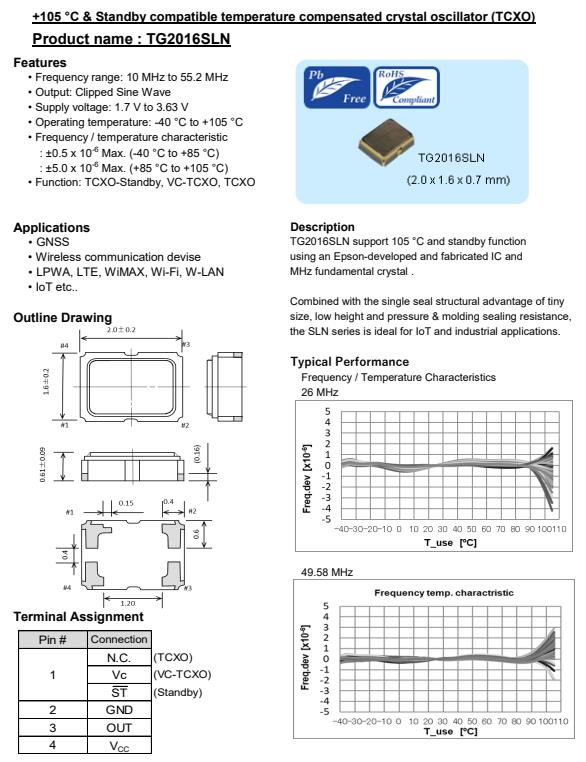 | X1G005731050116 | TG2016SLN | 26.000000 MHz | 2.00 x 1.60 x 0.61 mm | 1.700 to 1.900 V | +/-2.0 ppm | -40 to ++85 °C | +/-0.50 ppm |