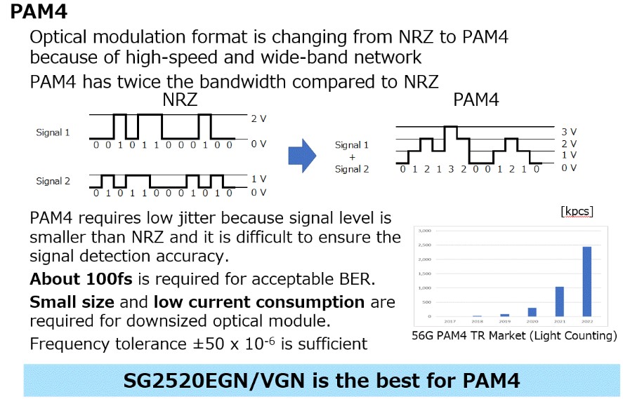 由于物聯網和ADAS等5G應用的實施,隨著數據流量的增長,網絡基礎設施變得比以往任何時候都更加重要。IT廠商一直在快速建設數據中心,對安裝在數據中心內部的光模塊有著巨大的需求。這種應用要求晶體振蕩器具有“小”、“低抖動”和“高穩定性”,而我們的SG2520系列貼片石英晶振可以滿足所有這些要求。以下是我們產品的特點,這些將有助于光模塊的性能。X1G0058810001專用于6G光學應用的小型封裝高穩定性振蕩器