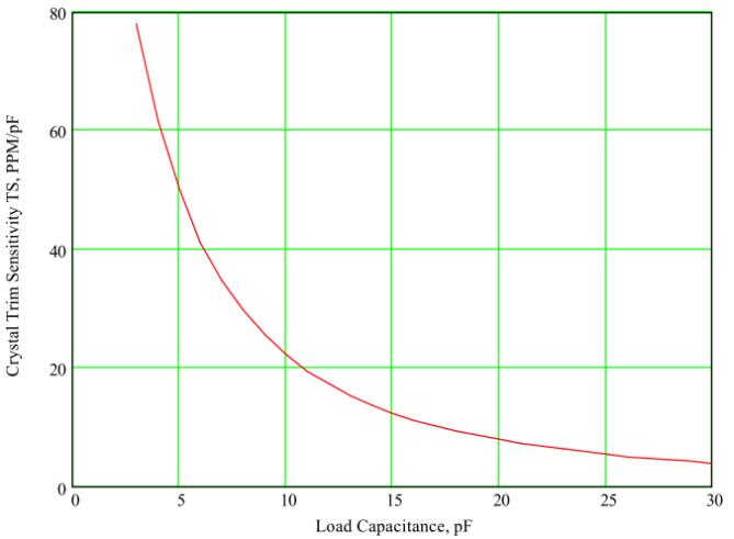 晶體制造商將晶體給定的負載電容的方程式(1.7)稱為“微調靈敏度”。 圖4是“修剪靈敏度”的圖形表示。