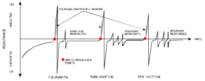 所有晶體都有許多諧振響應(見圖5)。 第一個主要回應是“基本面”。 在它的右邊,是下一個主要響應,即第三個泛音,然后是第五個泛音,依此類推。 只有奇異的泛音。 泛音響應不是基波的諧波。 根據定義,諧波是較低頻率的精確倍數。 例如,第三泛音通常位于基頻的2.8至3.2倍之間。 所以晶體有