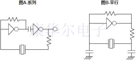 并聯(lián)諧振晶體適用于在石英晶體振蕩器反饋環(huán)路中包含電抗組件(電容器)的電路,這些電路取決于電抗元件和晶體,以實現(xiàn)在指定頻率下開始并保持振蕩的相移.串聯(lián)諧振晶體適用于在振蕩器反饋環(huán)路中不包含電抗組件的電路,請參見圖A的串聯(lián),圖B的并聯(lián)諧振晶體: 內(nèi)部電容(C1)(C2):