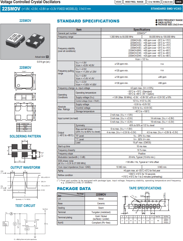 SMI晶振,壓控晶振,22SMOV晶振,SMI壓控晶振.貼片石英晶振,體積小,焊接可采用自動貼片系統,產品本身小型,表面貼片晶振,特別適用于有小型化要求的電子數碼產品市場領域,因產品小型,薄型優勢,耐環境特性,包括耐高溫,耐沖擊性等.