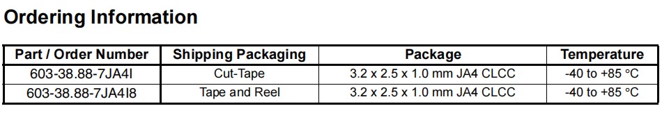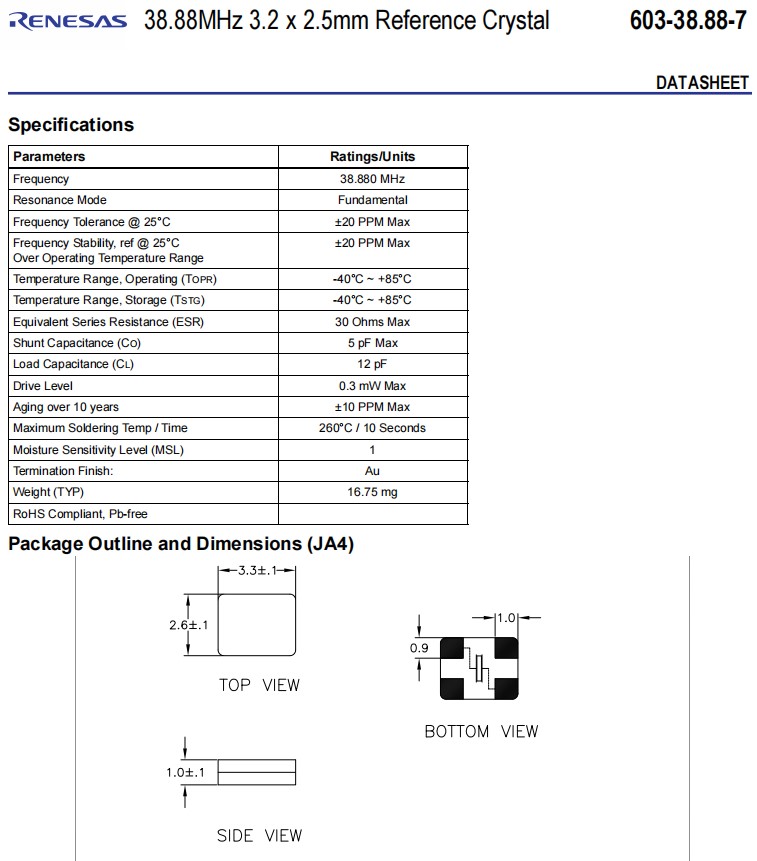 | 603-38.88-7JA4I | Renesas晶振 | CRYSTAL 38.8800MHZ 12PF SMD |