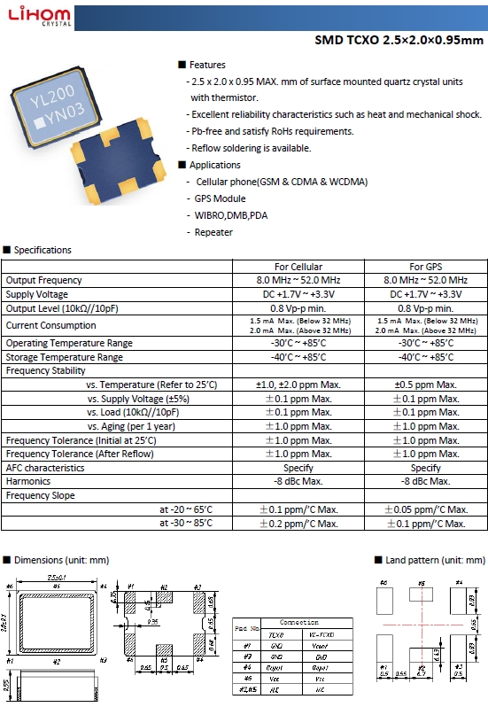 Lihom晶振,貼片晶振, BXT-252(V)振蕩器.溫補晶振(TCXO)產品本身具有溫度補償作用,高低溫度穩定性:頻率精度高0.5 PPM-2.0 PPM,工作溫度范圍:-30度至85度,電源電壓:1.7V-3.3V之間可供選擇,產品本身具有溫度電壓控制功能,世界上較薄的晶振封裝,頻率:26兆赫,33.6兆赫,38.4兆赫,40兆赫,因產品性能穩定,精度高等優勢,被廣泛應用到一些比較有品質的數碼通訊產品領域,導航定位系統,智能手機,WiMAX和蜂窩和無線通信等產品,符合RoHS/無鉛.