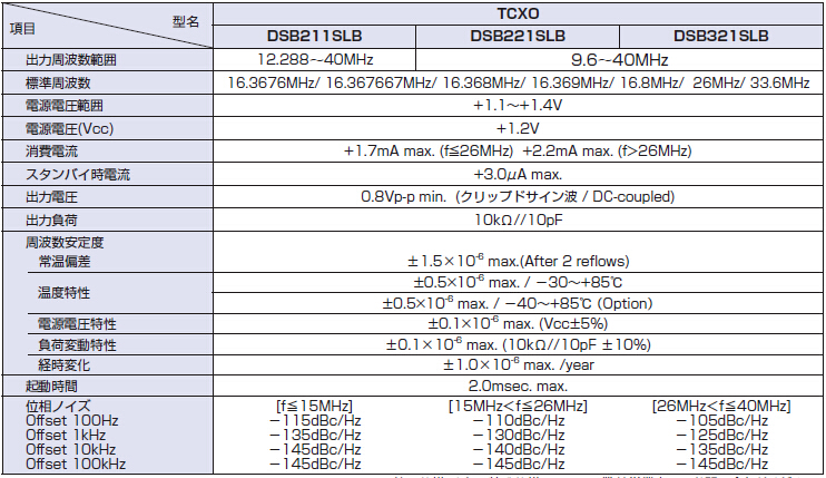 日本大真空株式會社,DSB211SLB(TCXO)晶振,車載導航系統晶振,頻率范圍12.288MHz~40.0MHz,小型SMD封裝2.0*1.6*0.63mm,低電壓1.1V~1.4V,頻率溫度穩定值±1.5×10-6,低相位抖動,主要用于攜帶電話,GPS,GMS,其他無線通信設備中.