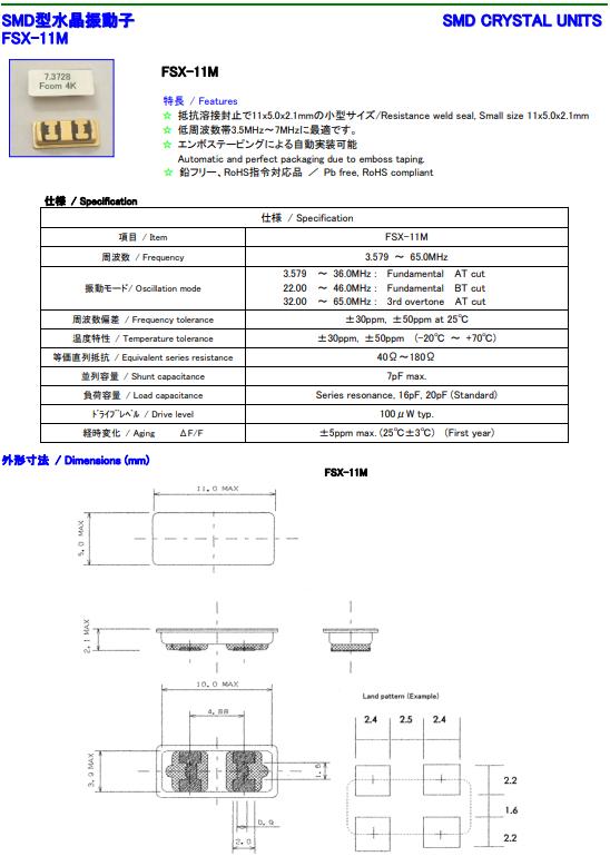 富士晶振,Quartz crystal,FSX-11M晶體.貼片晶振本身體積小,薄型石英晶體諧振器,特別適用于有目前高速發(fā)展的高端電子數(shù)碼產(chǎn)品,因為晶振本身小型化需求的市場領(lǐng)域,小型,薄型是對應陶瓷諧振器(偏差大)和普通的石英晶體諧振器(偏差小)的中間領(lǐng)域的一種性價比較出色的產(chǎn)品.產(chǎn)品廣泛用于筆記本電腦,無線電話,衛(wèi)星導航HDD,SSD,USB,Blu-ray等用途,符合無鉛焊接的高溫回流焊曲線特性.