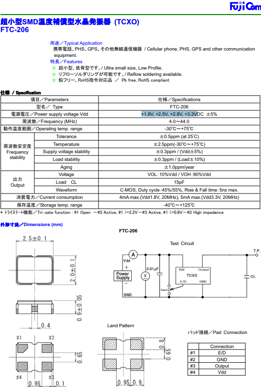 富士晶振,溫補振蕩器,FTC-206振蕩子.溫補晶振(TCXO)產品本身具有溫度補償作用,高低溫度穩定性:頻率精度高0.5PPM~2.0PPM,常用頻率:26M,33.6M,38.4M,40M.因產品性能穩定,精度高等優勢,被廣泛應用到一些比較品質的數碼通訊產品領域,導航定位系統,智能手機,WiMAX和無線通信等產品,符合RoHS/無鉛.