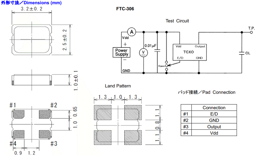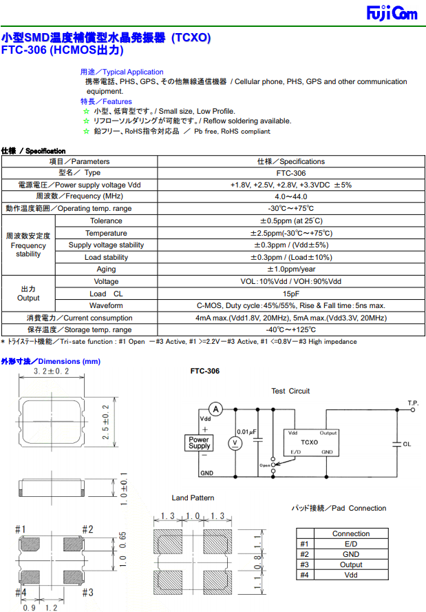 富士晶體,fujicom晶振,FTC-306溫補振蕩器.小型,輕型,低消耗電流,表面貼片型產品.(可對應回流焊)無鉛產品.富士晶振滿足無鉛焊盤的高溫回流溫度曲線要求,帶有AFC(頻率控制)功能,Enable/Disable功能,產品本身可根據使用需要進行選擇.