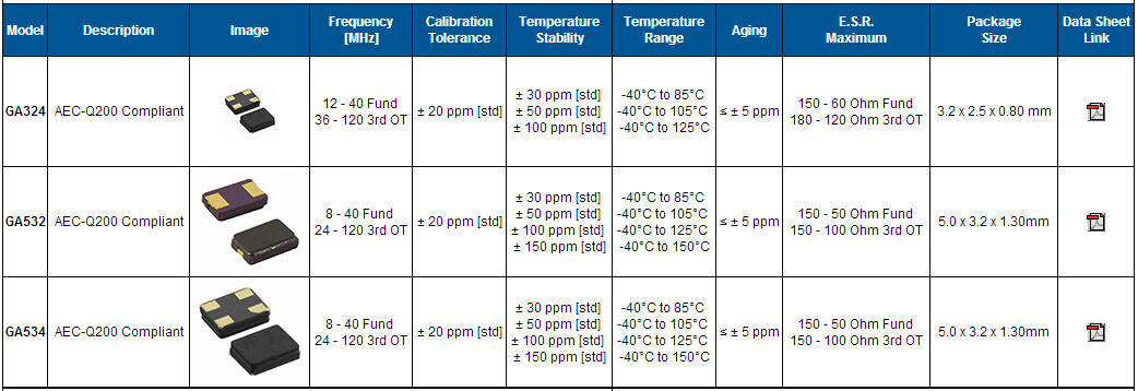 GA324陶瓷面晶振,3225mm晶體諧振器,CTS晶振代理商,標準3.2mm x 2.5mm陶瓷面封裝,基本設計頻率范圍12 ~ 40 MHz基本,36 ~120 MHz 3泛音,頻率公差;±20 ppm,±30 ppm和±50 ppm頻率穩定度,操作溫度參考訂購信息,-40℃~+ 125℃標準磁帶和卷軸包裝標準,通過無鉛認證符合歐盟指令,(歐盟-無鉛終止完成免稅,電氣和電子元件含鉛) GA324(Pb)在玻璃模型是一個低成本的專門開發用于汽車電子晶體.