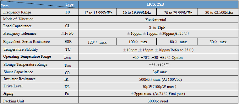 鴻星晶體諧振器HCX-2SB2520,HCX-1AB2016,HCX-TAB1612石英晶振,非常緊湊輕薄(2.5 * 2.0 * 0.65mm MAX)頻率范圍12M至62.5M.應用于手機和藍牙程序中.良好的耐熱性和耐沖擊性.無鉛的產品.這些能滿足使用無鉛焊料回流分析的要求.