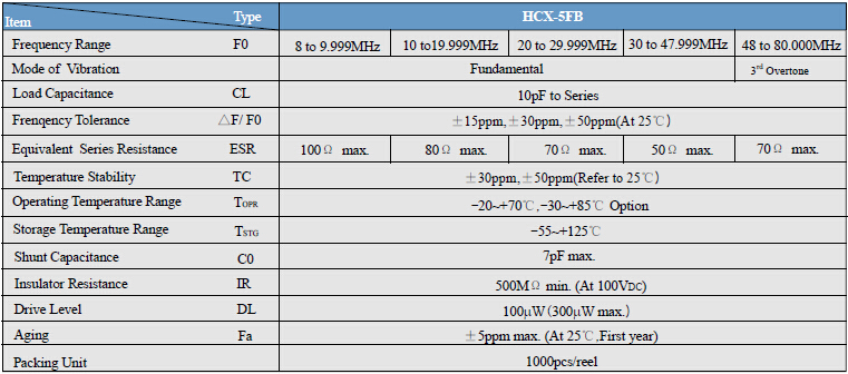 HCX-5FA二腳陶瓷面諧振器,5032mm智能手機晶振,臺灣鴻星晶振,是一個超微型包時鐘振蕩器尺寸為5.0 * 3.2 * 1.4mm.工作頻率8.0~80.0MHZ,頻率可以滿足大多數藍牙芯片,優良的電氣性能最優為手機和藍牙應用程序展示,良好的耐熱性和耐沖擊性,無鉛的產品,這些能滿足使用無鉛焊料回流分析的要求.