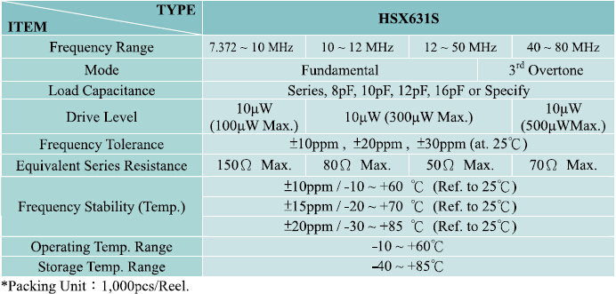 加高晶振特點,家用電冰箱晶振,HSX631S諧振器,尺寸大小6.0*3.5*1.0mm,頻率范圍7.372 to 80.0MHZ,工作溫度-20~+70℃耐高溫環境,三態函數應用于視覺的產物.貼片石英晶體,體積小,焊接可采用自動貼片系統,產品本身小型,表面貼片晶振,特別適用于有小型化要求的電子數碼產品市場領域,因產品小型,薄型優勢,耐環境特性,包括耐高溫,耐沖擊性等,在移動通信領域得到了廣泛的應用.