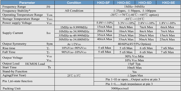 有源晶振HXO-S3225,HXO-N2520,HXO-M2016振蕩器,HXO-QS3225,HXO-QN2050鴻星晶振,非常緊湊輕薄(3.2 * 2.5 * 1.2mm MAX)頻率范圍1MHZ~54MHZ,工作電壓1.8V~5.0V.HXO-S系列超迷你包時鐘振蕩器尺寸為3.2 * 2.5 * 1.2毫米,主要用于便攜式電腦和電信設(shè)備和設(shè)備.