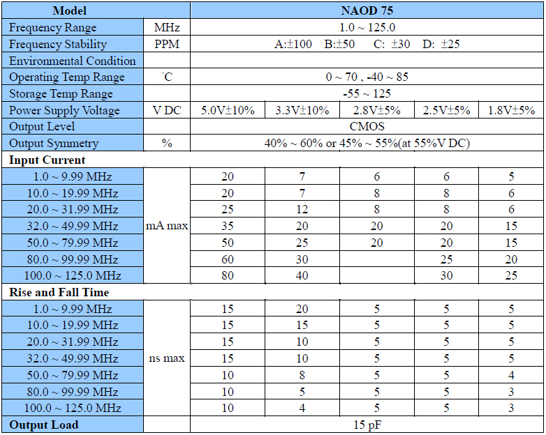 NAOD-75振蕩器,NSK石英晶振,5070mm有源晶振,CMOS輸出晶體振蕩器,頻率范圍1.0 to 125.0MHZ,尺寸大小7.0*5.0*1.6mm,無縫焊接具有,優(yōu)良的可焊性,符合無線環(huán)保要求,該款SMD振蕩器主要應(yīng)用于:PCMCIA卡,CCD,便攜式電,無線局域網(wǎng).