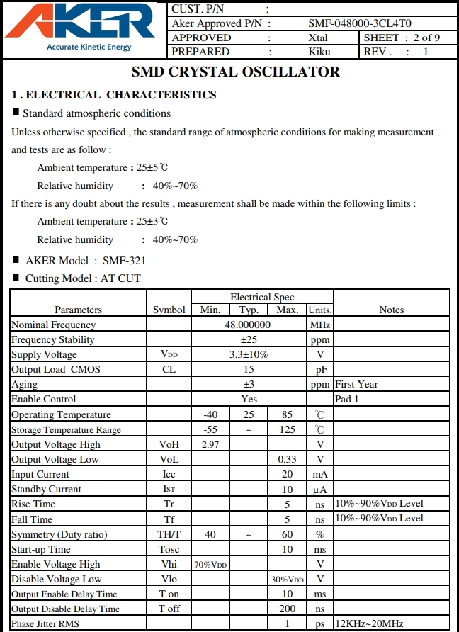 | 頻率 | 48MHz | 負載 | 15pF | 溫度范圍 | -40~ +85℃ |