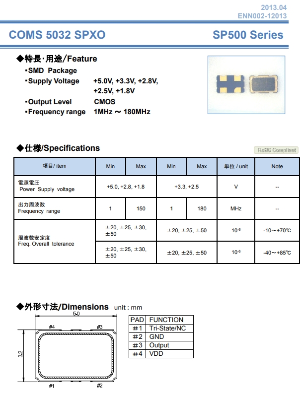 NAKA晶體,SPXO振蕩子,SP500晶振.小型表面貼片晶振型,是常用的NAKA晶振,適用于寬溫范圍的電子數碼產品,家電電器及MP3,MP4,播放器,單片機等領域.可對應8.000MHz以上的頻率,在電子數碼產品,以及家電相關電器領域里面發揮優良的電氣特性,滿足無鉛焊接的回流溫度曲線要求.