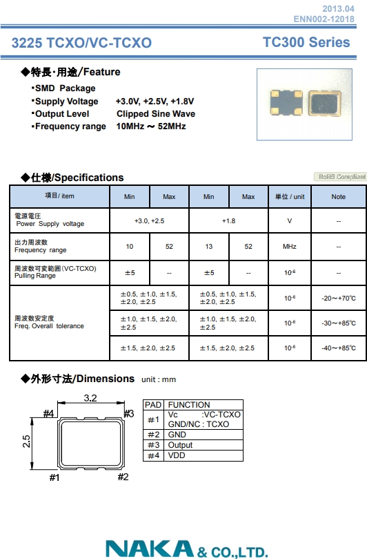 NAKA晶體,TCXO晶振,TC300石英晶體振蕩器.小型表面貼片型貼片晶振,較適合使用在汽車電子領(lǐng)域中,也是特別要求高可靠性的引擎控制用CPU的時鐘部分.低頻晶振可從7.98MHz起對應(yīng),小型,薄型具備強(qiáng)防焊裂性,NAKA Crystal在惡劣嚴(yán)酷的環(huán)境條件下也能發(fā)揮穩(wěn)定的起振特性,產(chǎn)品本身具有耐熱,耐振,耐撞擊等優(yōu)良的耐環(huán)境特性,滿足無鉛焊盤以及高溫回流溫度曲線要求,符合AEC-Q200認(rèn)證.