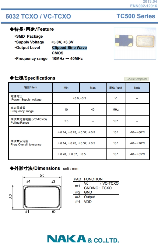 NAKA晶體,NAKA Crystal,TC500有源晶振.溫補晶振(TCXO)產品本身具有溫度補償作用,高低溫度穩(wěn)定性:頻率精度高0.5PPM~2.0PPM,常用頻率:26M,33.6M,38.4M,40M.因產品性能穩(wěn)定,精度高等優(yōu)勢,被廣泛應用到一些比較品質的數碼通訊產品領域,導航定位系統(tǒng),智能手機,WiMAX和無線通信等產品,符合RoHS/無鉛.