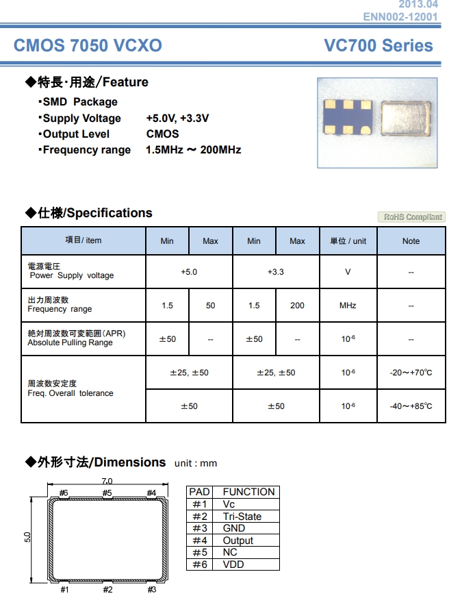 NAKA晶振,壓控晶振,VC700振蕩子.貼片石英晶體,體積小,焊接可采用自動(dòng)貼片系統(tǒng),產(chǎn)品本身小型,表面貼片晶振,特別適用于有小型化要求的電子數(shù)碼產(chǎn)品市場(chǎng)領(lǐng)域,因產(chǎn)品小型,薄型優(yōu)勢(shì),耐環(huán)境特性,包括耐高溫,耐沖擊性等