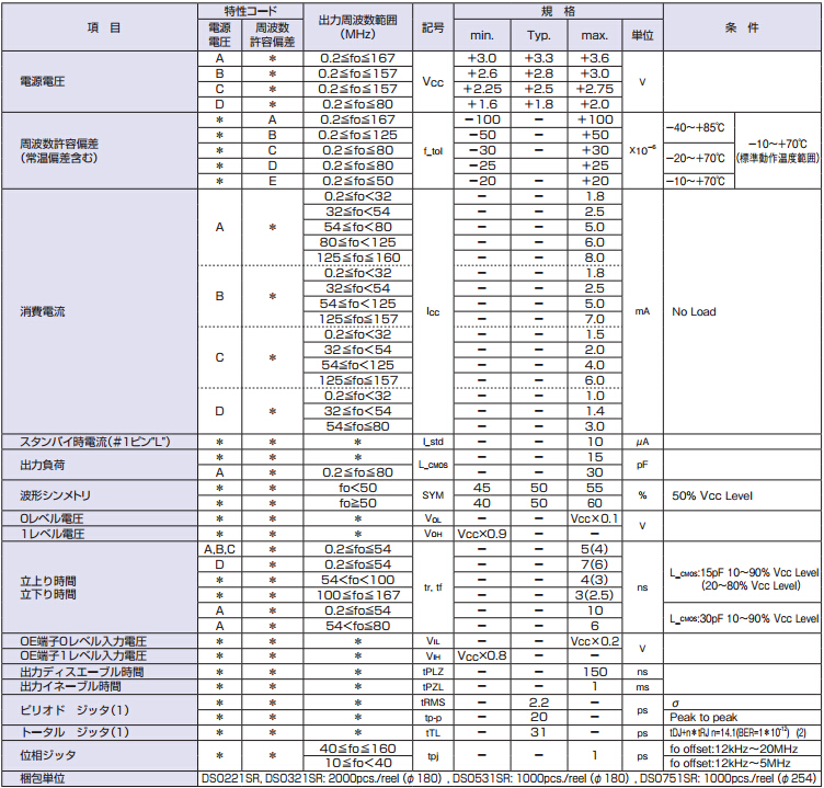 日本大真空株式會社,DSO531SR振蕩器,普通有源晶振,5032尺寸、薄型1.1mm,電源電壓1.8V/2.5V/2.8V/3.0V/3.3V,低消耗電流8mA max.(125MHz, 3.3V),帶三態功能,工作溫度-40℃~+125℃,主要用途PC、PDA 外圍設備、娛樂產品設備,DSC、DVD、Blu-ray Disk、TV、HDTV、DVC、HDD,攝像頭模塊,車載多媒體設備.