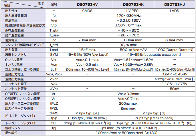日本大真空晶振,DSO753HJ振蕩器,數碼相機晶振,頻率范圍170.00MHz~230.00MHz,小型SMD封裝7.0*5.0*2.0mm,耐沖擊性,耐振動性,主要用于移動無線通信器和小型無線通訊設備中.石英晶體振蕩器在設計時就與各款型號IC匹配等相關技術,使用IC與晶片設計匹配技術:是高頻振蕩器研發及生產過程必須要解決的技術難題.