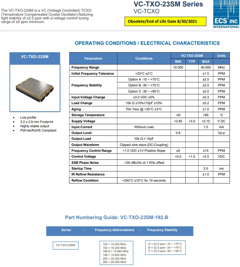 | VC-TXO-23SM-196.8-B | ECS晶振 | VC-TXO-23SM | 19.68MHz | -30°C ~ 75°C |