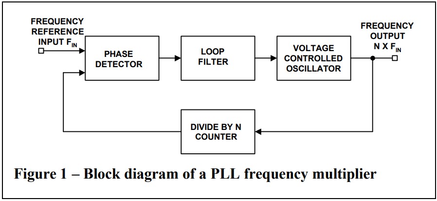 圖1包含了一個基本的PLL頻率乘法器的方框圖。該電路的操作是所有鎖相環的典型操作。它基本上是一個控制壓控晶體振蕩器(VCO)相位的反饋控制系統。將輸入信號應用于相位檢測器的一個輸入端。另一個輸入被連接到一個除以N個計數器的輸出上。通常情況下,這兩個信號的頻率將幾乎相同。相位檢測器的輸出是與兩個輸入之間的相位差成比例的電壓。此信號應用于回路貼片濾波器。它是一個循環濾波器,它決定了PLL的動態特性。濾波后的信號控制著VCO。請注意,VCO的輸出頻率是提供給頻率參考輸入的輸入的N倍。這個輸出信號通過除以N個計數器被發送回相位檢測器。