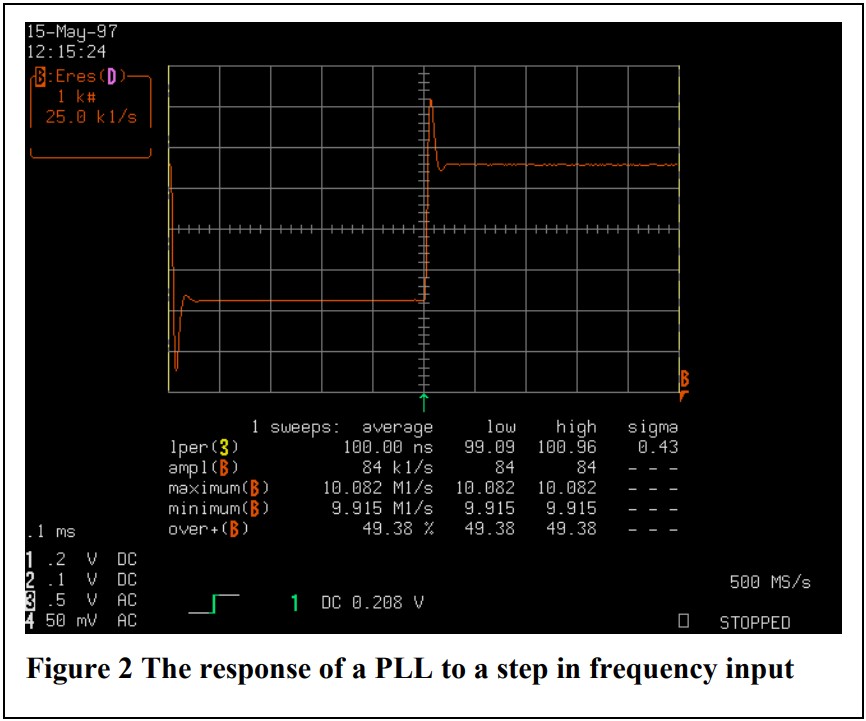 注意,PLL,縱軸的頻率顯示了50%的超調。這種輕微的阻尼響應是一種折衷,它實現了更快的旋轉率公差和中等的捕獲范圍。