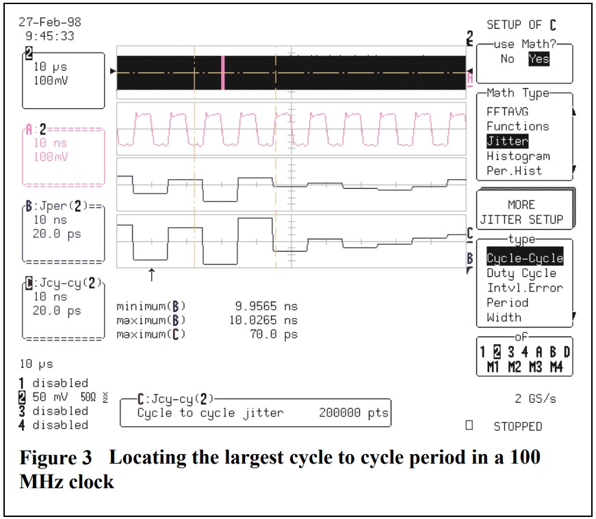 LeCroy示波器有多種方法可以用于PLL測量。石英晶振現代的高性能微處理器經常使用內部的PLL來增加系統時鐘頻率。制造商指定系統時鐘上允許的最大周期到周期變化。一個典型的特征是最大抖動小于250ps。由于PLL的輸出是不可訪問的,因此系統時鐘輸入滿足這個規范是很重要的。工程師可以通過使用抖動軌道循環循環測量系統時鐘來驗證系統時鐘是否符合本規范。這一點如圖3所示。在100us記錄的最大周期到周期周期差異是70ps。該值直接從Jitter跟蹤循環中讀取到軌跡c中的循環波形。垂直參數游標之間的區域標記為最大值。跟蹤A是采集數據的縮放放大,顯示了差異最大的兩個相鄰周期。軌跡B是抖動軌跡周期,它讀取時鐘波形的每個周期的絕對周期。