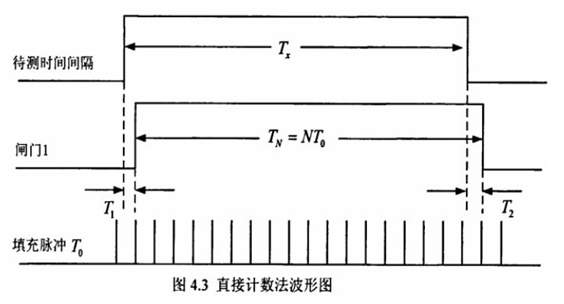 高精度的時間測量是實現馴服保持的基礎,一般都使用比時法測頻差的方法實現對恒溫晶振的鎖定,其中最常用的方法就是直接計數法,即在有待測時間間隔構成的閘門信號中填入脈沖,通過必要的計數電路,得到填充脈沖的個數后再乘以填充周期便可計算出待測的時間間隔。但是這種方法的測量精度很低,主要取決于填充脈沖的頻率,有源晶振頻率越高測量精度越高,但在實際應用中,這會大大提高對相應器件和線路的要求,同時還存在±1個字的量化誤差,直接計數法如圖4.3