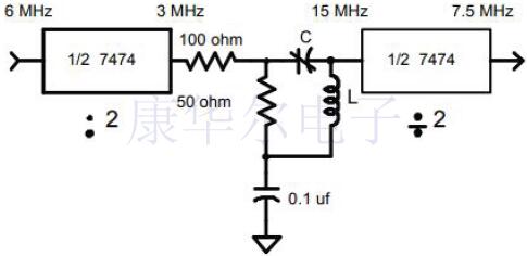 該合成器使用單個(gè)7474觸發(fā)器將6MHz輸入轉(zhuǎn)換為7.5MHz(倍數(shù)為1.25).來自石英振蕩器的6MHz方波被觸發(fā)器之一分頻,并施加到類似于圖2的網(wǎng)絡(luò)上.1.將3MHz(15MHz)的五次諧波除以第二觸發(fā)器產(chǎn)生7.5MHz.