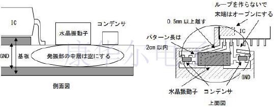 設置基于面接地的屏蔽時,如下圖左圖所示,在離元件搭載面最遠的面上設定接地圖案.另外,振蕩部的中層為了避免負電阻的減少,不得設置GND模式等,為了避免京瓷晶振振蕩波形因其他信號而受到調制,EMI增加的同時負電阻減少,不得設置其他信號線. 如上圖右側所示,元件搭載面的振蕩電路周邊的接地圖案若接近信號線,則EMI電平會減少,但若接近極端,則振蕩電路的負電阻會減少,因此為了防止負電阻降低,請設定在距振蕩電路的信號線0.5mm以上的位置.特別是從IN側產(chǎn)生的EMI的量本來就很少,因此不需要使GND圖案極端接近,而且通過使GND圖案極端接近,負電阻會大幅減少,因此不理想.