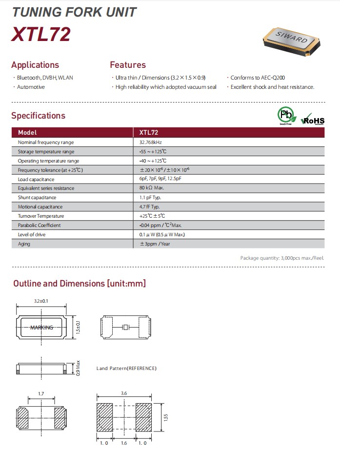 耐高溫6G晶振,XTL721-S999-301,Siward車載電子晶振,32.768KHz晶振,兩腳貼片晶振,參數表